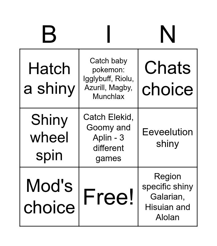 This bingo card has 10 words: Free!, Chats choice, Hatch a shiny, Catch Elekid, Goomy and Aplin - 3 different games, Shiny wheel spin, Mod's choice, Catch baby pokemon: Igglybuff, Riolu, Azurill, Magby, Munchlax, Legendary shiny in DA, Eeveelution shiny and Region specific shiny Galarian, Hisuian and Alolan.