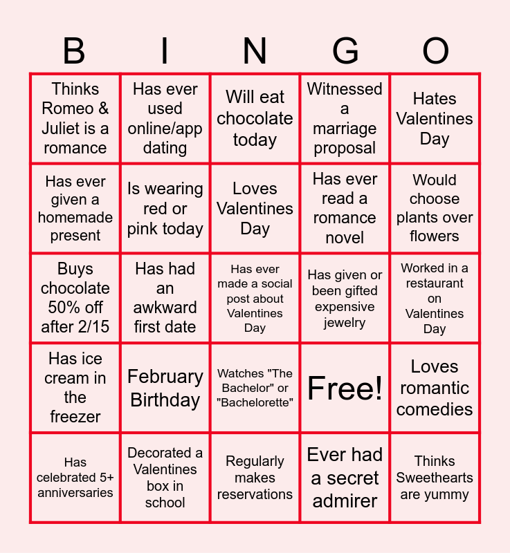This bingo card has 25 words: February Birthday, Regularly makes reservations, Loves Valentines Day, Has celebrated 5+ anniversaries, Hates Valentines Day, Thinks Romeo & Juliet is a romance, Has ever given a homemade present, Has ever used online/app dating, Has given or been gifted expensive jewelry, Watches "The Bachelor" or "Bachelorette", Has ever read a romance novel, Buys chocolate 50% off after 2/15, Free!, Loves romantic comedies, Is wearing red or pink today, Thinks Sweethearts are yummy, Worked in a restaurant on Valentines Day, Will eat chocolate today, Would choose plants over flowers, Has had an awkward first date, Has ever made a social post about Valentines Day, Decorated a Valentines box in school, Has ice cream in the freezer, Witnessed a marriage proposal and Ever had a secret admirer.