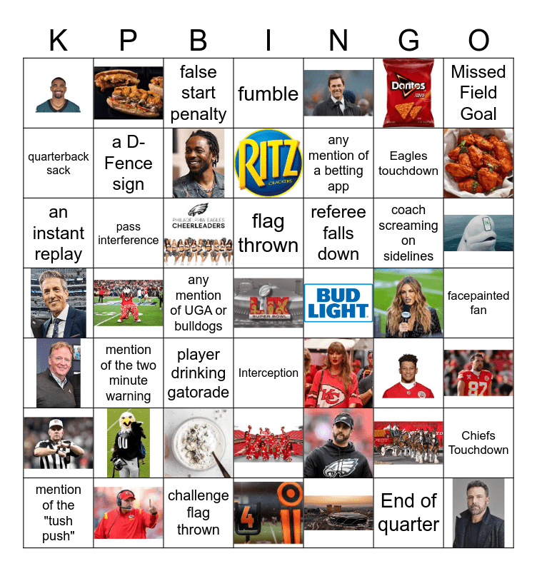 This bingo card has 27 images, a free space and 23 words: Chiefs Touchdown, Eagles touchdown, End of quarter, Interception, Missed Field Goal, fumble, coach screaming on sidelines, referee falls down, facepainted fan, quarterback sack, mention of the "tush push", any mention of a betting app, any mention of UGA or bulldogs, a D-Fence sign, challenge flag thrown, false start penalty, flag thrown, shirtless fan, an instant replay, player drinking gatorade, mention of the two minute warning, pass interference and made field goal.