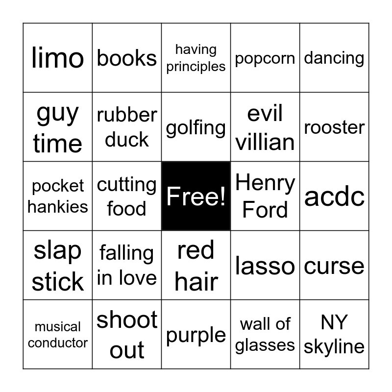 This bingo card has a free space and 30 words: shoot out, reindeer, cutting food, Bank, limo, having principles, rubber duck, red hair, Henry Ford, purple, acdc, NY skyline, wall of glasses, rifle, rooster, 🌟 star, lasso, slap stick, falling in love, dancing, pocket hankies, con, books, evil villian, guy time, popcorn, curse, musical conductor, golfing and harp.