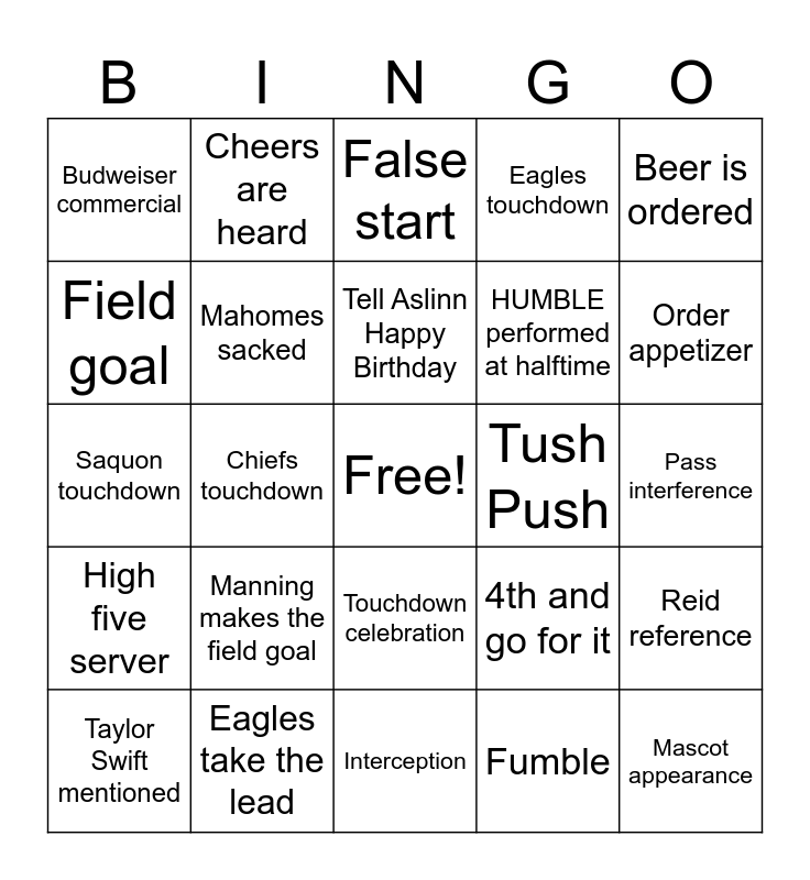 This bingo card has a free space and 24 words: Manning makes the field goal, Eagles take the lead, Tell Aslinn Happy Birthday, Taylor Swift mentioned, Beer is ordered, Budweiser commercial, Field goal, Cheers are heard, Tush Push, Touchdown celebration, HUMBLE performed at halftime, Saquon touchdown, 4th and go for it, Reid reference, Mahomes sacked, Fumble, Pass interference, False start, Order appetizer, Chiefs touchdown, Mascot appearance, High five server, Eagles touchdown and Interception.