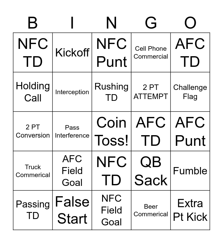 This bingo card has a free space and 25 words: AFC Field Goal, NFC Field Goal, Rushing TD, Passing TD, AFC TD, NFC TD, Holding Call, Kickoff, AFC TD, NFC TD, 2 PT ATTEMPT, 2 PT Conversion, QB Sack, Fumble, Interception, Off-Sides, AFC Punt, NFC Punt, Challenge Flag, Pass Interference, Extra Pt Kick, False Start, Truck Commerical, Cell Phone Commercial and Beer Commerical.