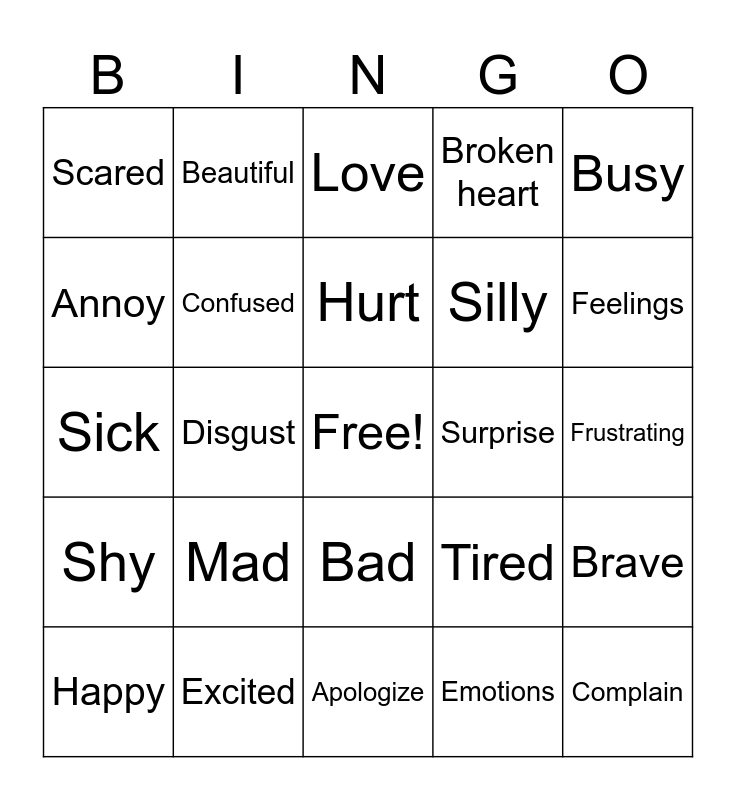 This bingo card has a free space and 29 words: Happy, Sad, Disgust, Bored, Scared, Love, Confused, Mad, Surprise, Excited, Frustrating, Complain, Apologize, Emotions, Feelings, Good, Bad, Shy, Busy, Sick, Tired, Sleepy, Silly, Annoy, Broken heart, Beautiful, Brave, Hurt and Pay Attention.