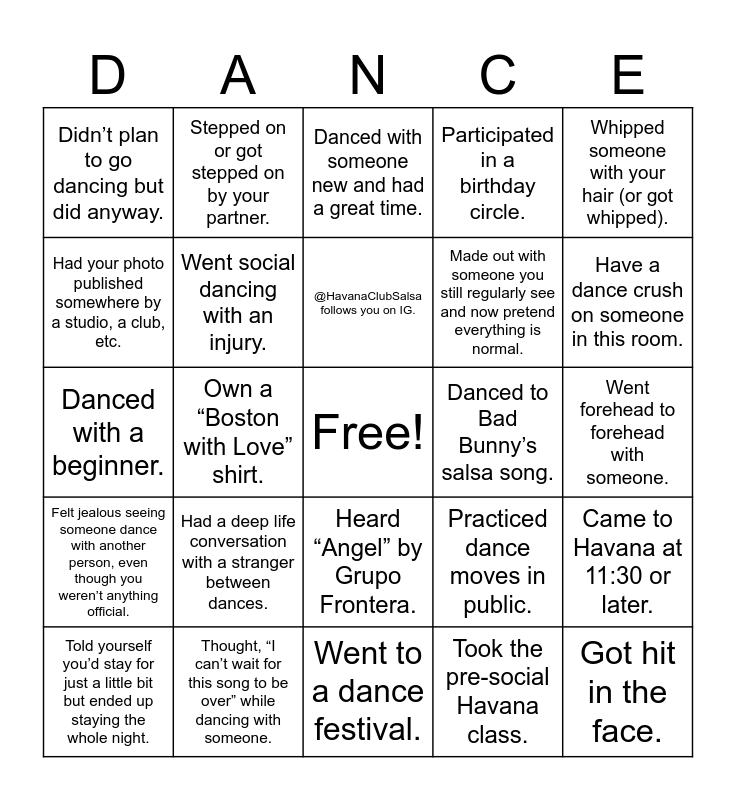 This bingo card has a free space and 44 words: Hit someone in the face., Got hit in the face., Had someone not let go at the end of a song and just danced for a second song without asking., Told yourself you’d stay for just a little bit but ended up staying the whole night., Danced with someone who taught mid-dance (unsolicited)., Took the pre-social Havana class., Danced with someone new and had a great time., Had someone dramatically sing the song while dancing with you., Whipped someone with your hair (or got whipped)., Thought, “I can’t wait for this song to be over” while dancing with someone., Participated in a birthday circle., Danced to Bad Bunny’s salsa song., Heard “Angel” by Grupo Frontera., Had a deep life conversation with a stranger between dances., Went to a dance class or workshop., Went to a dance festival., Used the “I’m taking a break” excuse., Danced with a beginner., Currently have a dance crush., Have a dance crush on someone in this room., Stepped on or got stepped on by your partner., Had a terrible dance with someone you normally dance really well with., Shazamed a song during a social., Didn’t plan to go dancing but did anyway., Got jealous because your dance crush was dancing with someone else., Went forehead to forehead with someone., Danced to a song as the opposite role you normally do., Went to Havana at least twice in a week., Practiced dance moves in public., Felt jealous seeing someone dance with another person, even though you weren’t anything official., Vibed too hard and forgot about your partner for a bit., Came to Havana at 11:30 or later., Got told no (for any reason)., Had a partner make you laugh mid-dance., Own a “Boston with Love” shirt., Own Fuegos or dance heels., Danced with someone just to make someone else jealous., Left plans early just to go dancing., @HavanaClubSalsa follows you on IG., Had your photo published somewhere by a studio, a club, etc., Made out with someone you still regularly see and now pretend everything is normal., Had a brief situationship with someone and now pretend you don’t know each other., Went social dancing with an injury. and Avoided someone at a social because of unresolved tension..