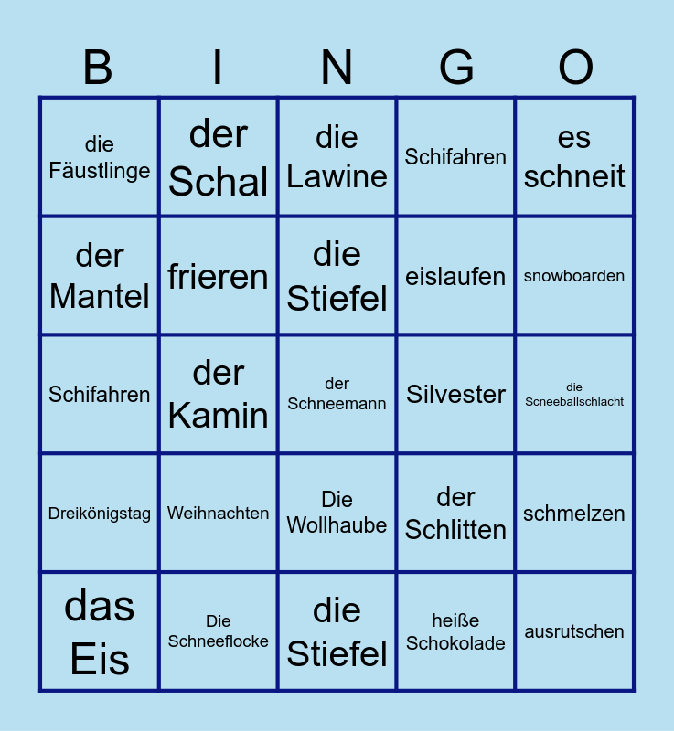 This bingo card has a free space and 24 words: Weihnachten, Die Schneeflocke, die Stiefel, das Eis, es schneit, die Fäustlinge, der Mantel, der Schal, Silvester, Die Wollhaube, eislaufen, Schifahren, der Schlitten, schmelzen, frieren, heiße Schokolade, die Scneeballschlacht, die Lawine, snowboarden, der Kamin, ausrutschen, Dreikönigstag, Schifahren and die Stiefel.