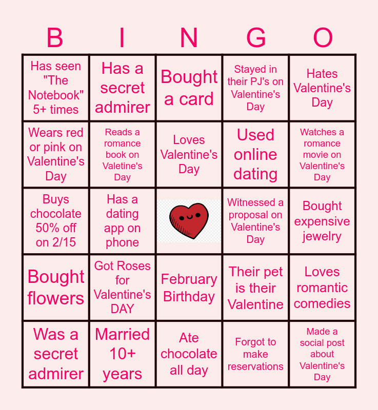 This bingo card has a free space and 26 words: February Birthday, Forgot to make reservations, Loves Valentine's Day, Married 10+ years, Hates Valentine's Day, Has seen "The Notebook" 5+ times, Wears red or pink on Valentine's Day, Has a secret admirer, Bought expensive jewelry, Their pet is their Valentine, Used online dating, Buys chocolate 50% off on 2/15, Loves romantic comedies, Was a secret admirer, Has a dating app on phone, Worked in a restaurant on Valentine's Day, Stayed in their PJ's on Valentine's Day, Bought flowers, Bought a card, Made a social post about Valentine's Day, Watches a romance movie on Valentine's Day, Ate chocolate all day, Witnessed a proposal on Valentine's Day, Got Roses for Valentine's DAY, Reads a romance book on Valetine's Day and Cooked dinner for their Valentine.