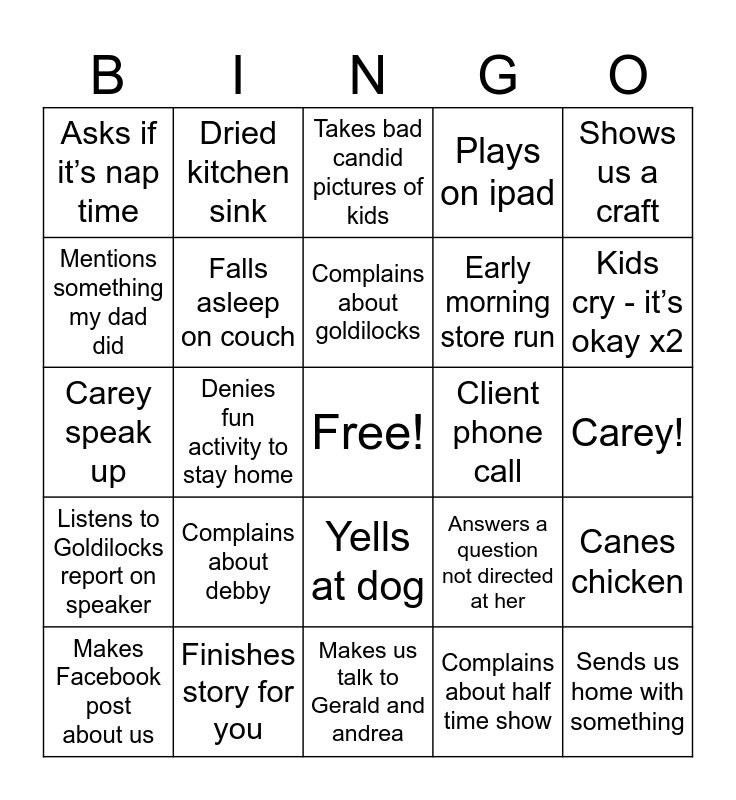 This bingo card has a free space and 28 words: Canes chicken, Says something is too sweet, Early morning store run, Complains about half time show, Mentions something my dad did, Takes bad candid pictures of kids, Dried kitchen sink, Listens to Goldilocks report on speaker, Client phone call, Makes Facebook post about us, Carey speak up, Plays on ipad, Finishes story for you, Makes us talk to Gerald and andrea, Kids cry - it’s okay x2, Buys us food, Complains about debby, Falls asleep on couch, Complains about goldilocks, Yells at dog, Asks if it’s nap time, Asks us if we want a scramble, Sends us home with something, Denies fun activity to stay home, Carey!, Answers a question not directed at her, Shows us a craft and Brings up boston.
