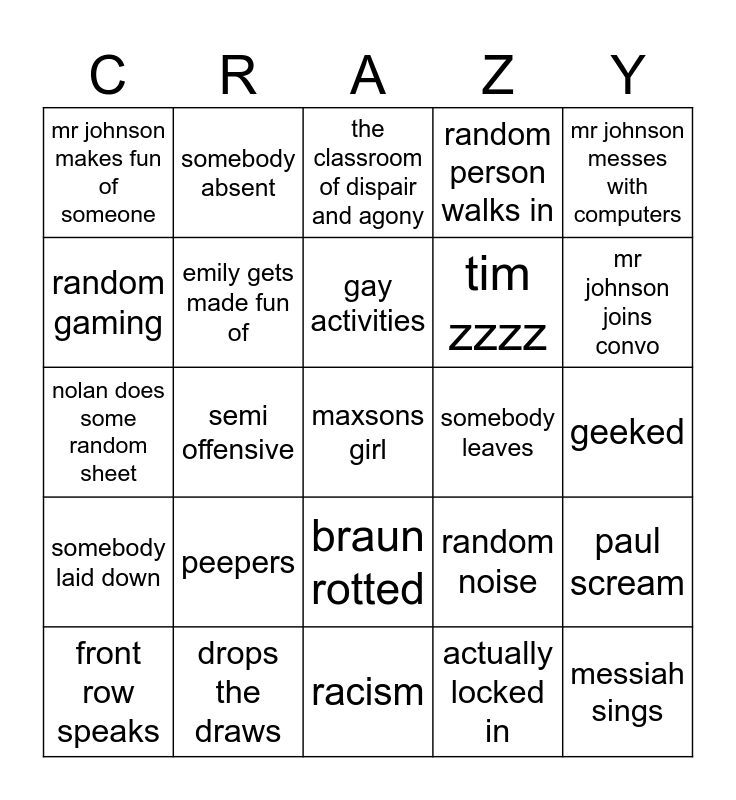 This bingo card has a free space and 24 words: peepers, drops the draws, gay activities, front row speaks, mr johnson messes with computers, mr johnson makes fun of someone, random gaming, somebody absent, somebody leaves, braun rotted, tim zzzz, nolan does some random sheet, random noise, paul scream, emily gets made fun of, actually locked in, geeked, the classroom of dispair and agony, mr johnson joins convo, semi offensive, messiah sings, somebody laid down, random person walks in and racism.