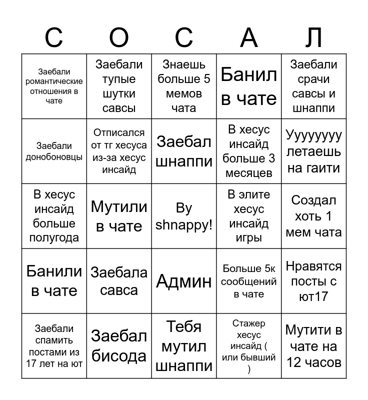 This bingo card has a free space and 24 words: Заебала савса, Заебал бисода, Заебал шнаппи, Заебали спамить постами из 17 лет на ют, Заебали срачи савсы и шнаппи, Заебали романтические отношения в чате, Заебали донобоновцы, Заебали тупые шутки савсы, В элите хесус инсайд игры, Админ, В хесус инсайд больше 3 месяцев, В хесус инсайд больше полугода, Больше 5к сообщений в чате, Нравятся посты с ют17, Отписался от тг хесуса из-за хесус инсайд, Стажер хесус инсайд ( или бывший ), Создал хоть 1 мем чата, Знаешь больше 5 мемов чата, Уууууууу летаешь на гаити, Мутили в чате, Мутити в чате на 12 часов, Банили в чате, Банил в чате and Тебя мутил шнаппи.