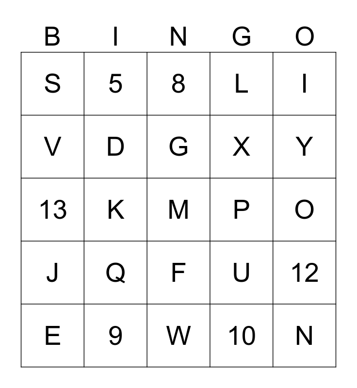 This bingo card has a free space and 39 words: A, B, C, D, E, F, G, H, I, J, K, L, N, O, P, Q, R, S, T, U, V, W, X, Y, Z, 1, 2, 3, 4, 5, 6, 7, 8, 9, 10, 11, 12, 13 and 14.