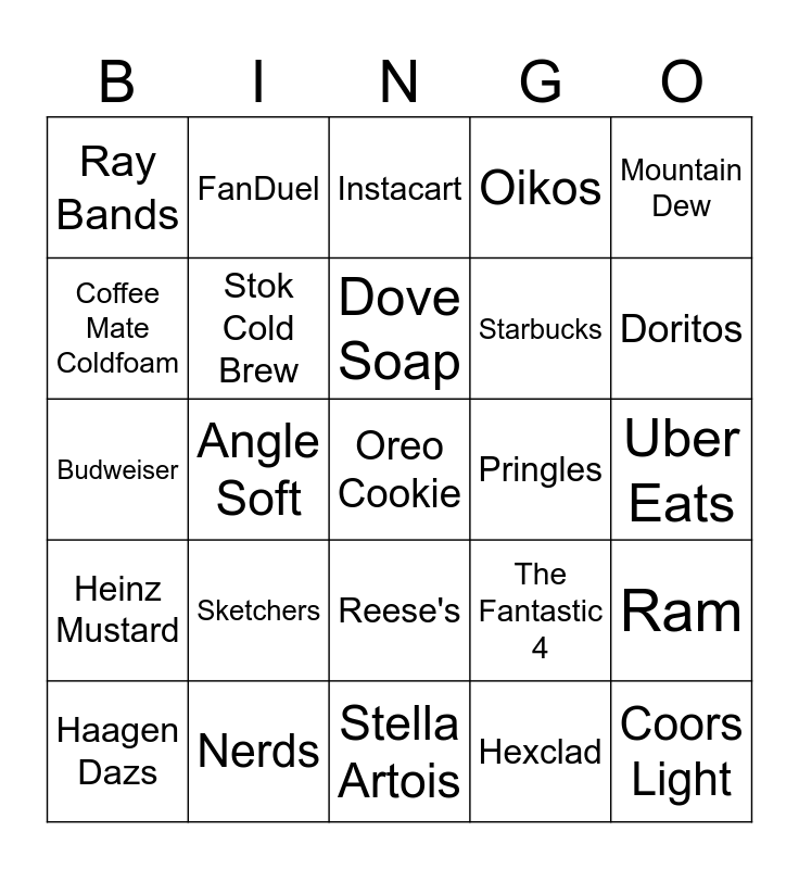 This bingo card has a free space and 44 words: Bud Light, Coors Light, Go Daddy, Haagen Dazs, Hellmanns, Hexclad, Instacart, Michelob Ultra, Mountain Dew, Nerds, Oikos, Pringles, Reese's, Sketchers, Square space, Stella Artois, Booking .com, Budweiser, Cirkul, Doritos, FanDuel, Hims & Hers, Nerd Wallet, Ray Bands, Totinos, Uber Eats, Zeam, Taco Bell, The Fantastic 4, Heinz Mustard, Turbo Tax, Ram, Google AI, Little Ceasars, Angle Soft, Tubi, Homes .com, Franks Red Hot, Dove Soap, Coffee Mate Coldfoam, Starbucks, Ridge Crew, Stok Cold Brew and Door Dash.