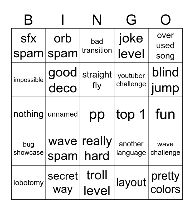 This bingo card has a free space and 24 words: wave spam, secret way, straight fly, lobotomy, over used song, sfx spam, impossible, orb spam, top 1, really hard, youtuber challenge, nothing, another language, wave challenge, good deco, layout, fun, bad transition, blind jump, unnamed, pretty colors, bug showcase, joke level and troll level.