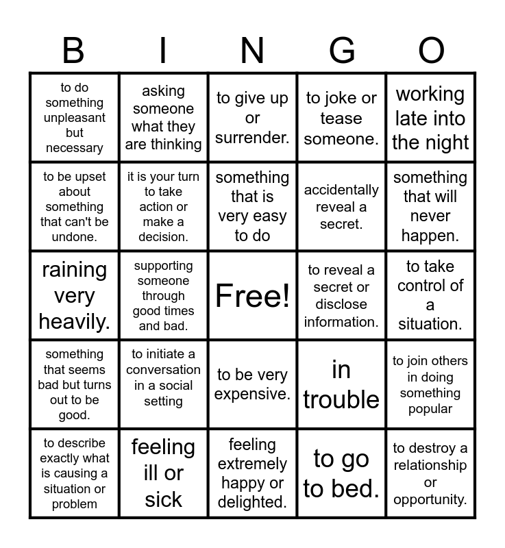 This bingo card has a free space and 24 words: to initiate a conversation in a social setting, feeling ill or sick, something that is very easy to do, to describe exactly what is causing a situation or problem, working late into the night, to do something unpleasant but necessary, to be upset about something that can't be undone., asking someone what they are thinking, to reveal a secret or disclose information., to be very expensive., accidentally reveal a secret., raining very heavily., in trouble, to join others in doing something popular, it is your turn to take action or make a decision., to go to bed., to take control of a situation., to give up or surrender., something that will never happen., supporting someone through good times and bad., to destroy a relationship or opportunity., something that seems bad but turns out to be good., to joke or tease someone. and feeling extremely happy or delighted..