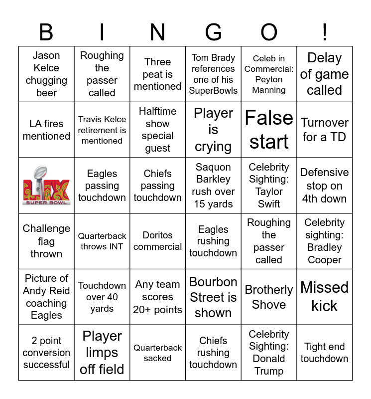 This bingo card has 1 images and 35 words: Bourbon Street is shown, Any team scores 20+ points, Chiefs rushing touchdown, LA fires mentioned, Challenge flag thrown, Saquon Barkley rush over 15 yards, Travis Kelce retirement is mentioned, Quarterback sacked, Celeb in Commercial: Peyton Manning, Brotherly Shove, Turnover for a TD, Tom Brady references one of his SuperBowls, Missed kick, Eagles passing touchdown, Player is crying, Jason Kelce chugging beer, Picture of Andy Reid coaching Eagles, Celebrity Sighting: Taylor Swift, Three peat is mentioned, Chiefs passing touchdown, Quarterback throws INT, Eagles rushing touchdown, Doritos commercial, Roughing the passer called, Roughing the passer called, False start, Player limps off field, Halftime show special guest, Delay of game called, Tight end touchdown, 2 point conversion successful, Celebrity sighting: Bradley Cooper, Defensive stop on 4th down, Touchdown over 40 yards and Celebrity Sighting: Donald Trump.