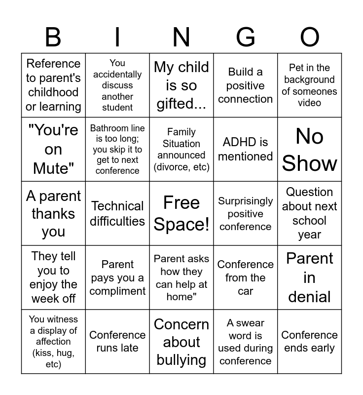 This bingo card has a free space and 29 words: You witness a display of affection (kiss, hug, etc), Reschedule, Technical difficulties, Student says hello to you or waves, Reference to parent's childhood or learning, My child is so gifted..., Bathroom line is too long; you skip it to get to next conference, Parent pays you a compliment, Surprisingly positive conference, Conference runs late, Question about next school year, Conference ends early, Concern about bullying, A swear word is used during conference, No Show, Someone walks in your room while you're on a call, Parent asks how they can help at home", They tell you to enjoy the week off, Pet in the background of someones video, A parent thanks you, Conference from the car, Someone cries, ADHD is mentioned, "You're on Mute", Build a positive connection, You accidentally discuss another student, Parent in denial, Family Situation announced (divorce, etc) and Parent/ Guardian clearly distracted during call.