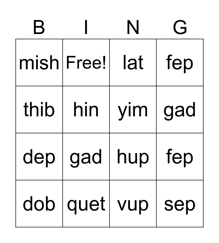 This bingo card has 19 words: hup, gaz, lat, sep, fep, thib, vup, mish, Free!, dep, gad, hin, yim, quet, dob, yab, fep, gad and dob.
