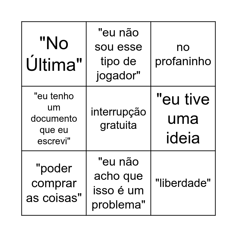 This bingo card has a free space and 8 words: "eu tive uma ideia, no profaninho, "eu não sou esse tipo de jogador", "poder comprar as coisas", "No Última", "liberdade", "eu tenho um documento que eu escrevi" and "eu não acho que isso é um problema".