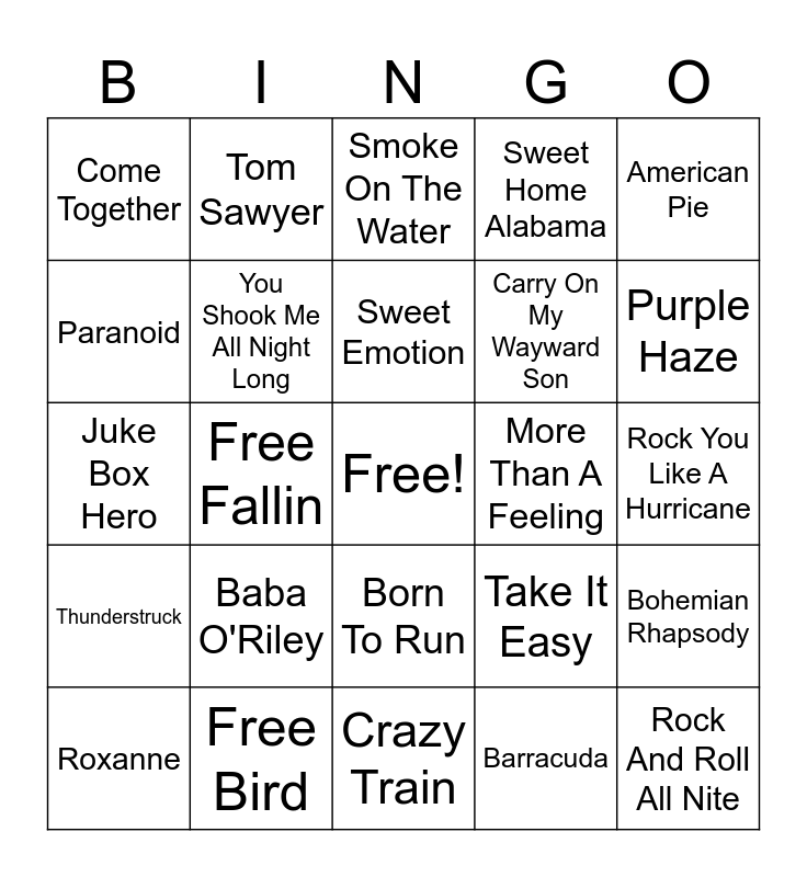 This bingo card has a free space and 24 words: Baba O'Riley, Free Bird, Sweet Emotion, Roxanne, American Pie, Come Together, Paranoid, Tom Sawyer, More Than A Feeling, Born To Run, Carry On My Wayward Son, Juke Box Hero, Take It Easy, Bohemian Rhapsody, You Shook Me All Night Long, Barracuda, Rock You Like A Hurricane, Smoke On The Water, Purple Haze, Free Fallin, Rock And Roll All Nite, Thunderstruck, Sweet Home Alabama and Crazy Train.