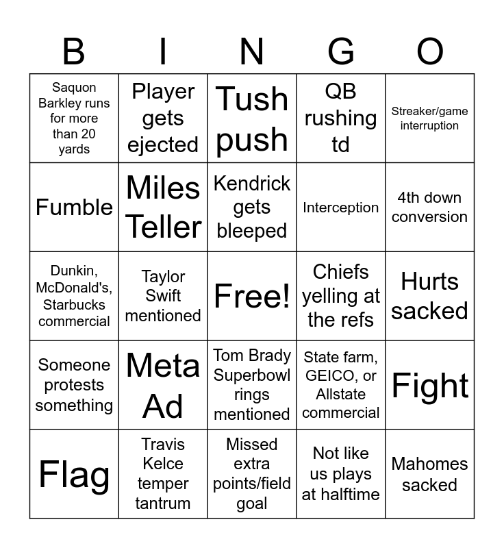 This bingo card has a free space and 29 words: Flag, Patrick Mahomes praise, Taylor Swift mentioned, Jason Kelce drunk, Saquon Barkley runs for more than 20 yards, Tush push, Miles Teller, Meta Ad, Chiefs yelling at the refs, Travis Kelce temper tantrum, Hurts sacked, Mahomes sacked, Missed extra points/field goal, Not like us plays at halftime, 4th down conversion, Tom Brady stumbles, Tom Brady Superbowl rings mentioned, Someone protests something, Streaker/game interruption, Dunkin, McDonald's, Starbucks commercial, State farm, GEICO, or Allstate commercial, Car commercial, Interception, Fumble, QB rushing td, Player gets ejected, Fight, Kendrick gets bleeped and Military flyover.