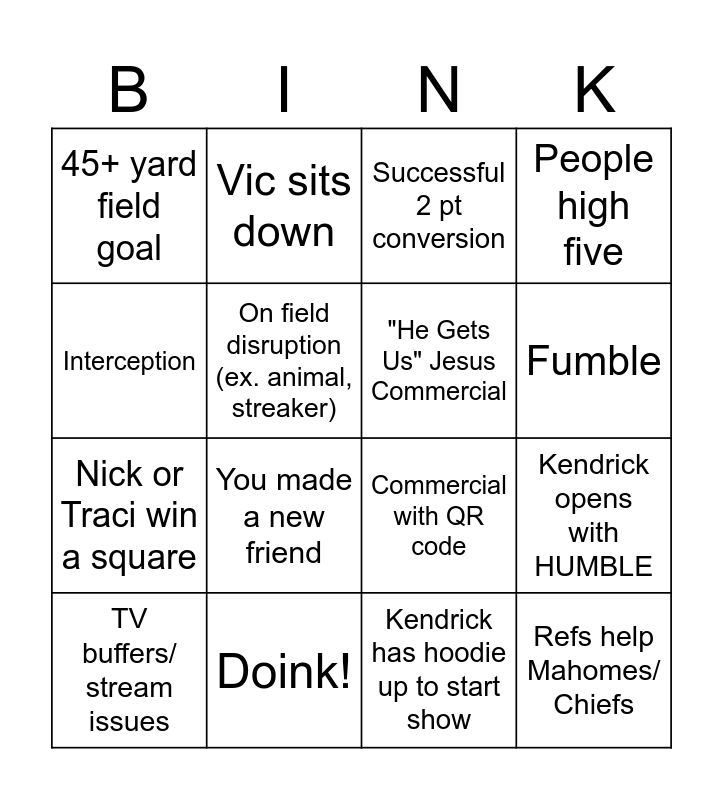 This bingo card has 22 words: Doink!, Tom AND Brandon appear, Vic sits down, Saquon TD, On field disruption (ex. animal, streaker), "He Gets Us" Jesus Commercial, 45+ yard field goal, Successful 2 pt conversion, Commercial with QR code, Refs help Mahomes/ Chiefs, Nick or Traci win a square, People high five, Uniform praise or critique, Someone asks about the rules, Kendrick has hoodie up to start show, Nathan or Danny say something about dairy or protein, Kendrick opens with HUMBLE, TV buffers/ stream issues, You made a new friend, Interception, Fumble and "Who is winning?".