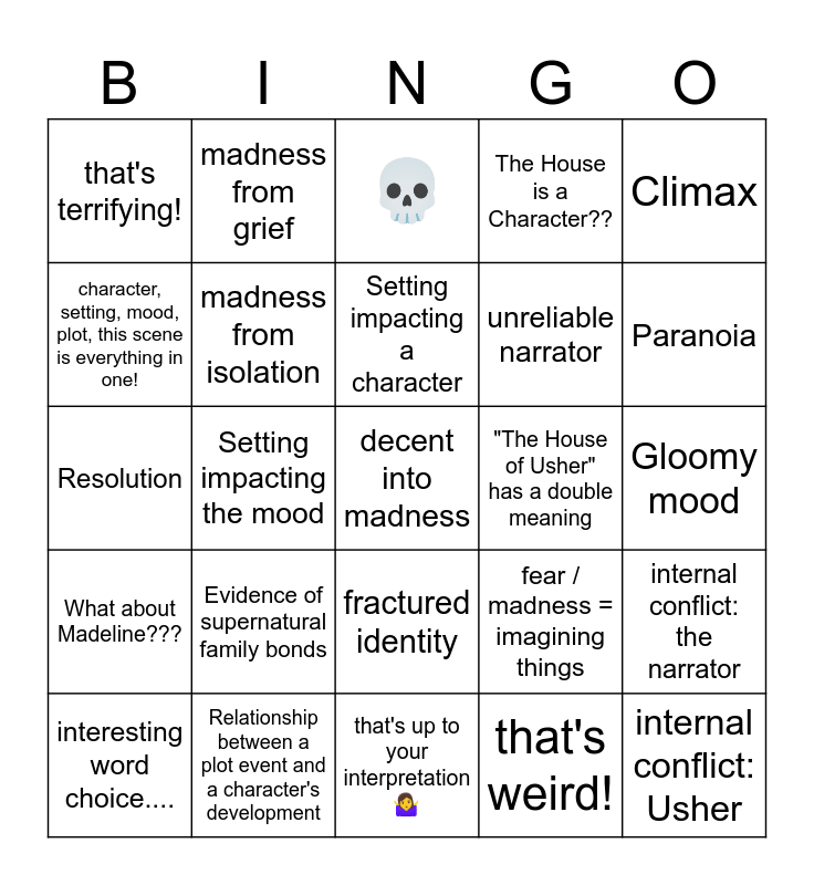 This bingo card has 25 words: Evidence of supernatural family bonds, that's up to your interpretation 🤷♀️, Setting impacting a character, interesting word choice...., Climax, that's terrifying!, character, setting, mood, plot, this scene is everything in one!, madness from grief, "The House of Usher" has a double meaning, fractured identity, unreliable narrator, Resolution, fear / madness = imagining things, internal conflict: the narrator, madness from isolation, internal conflict: Usher, Gloomy mood, 💀, Paranoia, Setting impacting the mood, decent into madness, Relationship between a plot event and a character's development, What about Madeline???, The House is a Character?? and that's weird!.