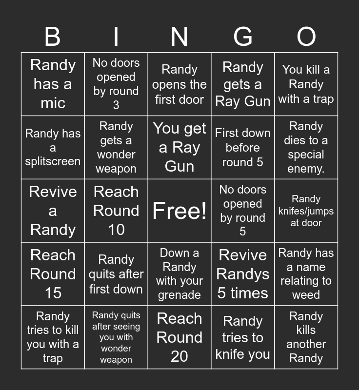 This bingo card has a free space and 24 words: Randy quits after first down, Randy quits after seeing you with wonder weapon, You get a Ray Gun, Randy tries to kill you with a trap, You kill a Randy with a trap, Randy has a mic, Randy has a splitscreen, No doors opened by round 3, No doors opened by round 5, Down a Randy with your grenade, First down before round 5, Revive a Randy, Revive Randys 5 times, Randy has a name relating to weed, Randy gets a wonder weapon, Randy tries to knife you, Randy knifes/jumps at door, Randy opens the first door, Randy dies to a special enemy., Reach Round 10, Randy kills another Randy, Reach Round 15, Randy gets a Ray Gun and Reach Round 20.