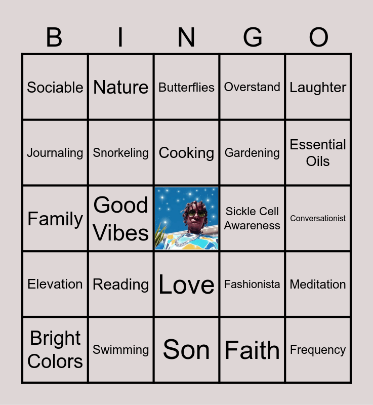 This bingo card has a free space and 24 words: Reading, Swimming, Cooking, Bright Colors, Laughter, Sociable, Journaling, Nature, Sickle Cell Awareness, Love, Gardening, Family, Fashionista, Meditation, Snorkeling, Faith, Conversationist, Butterflies, Essential Oils, Good Vibes, Frequency, Elevation, Overstand and Son.