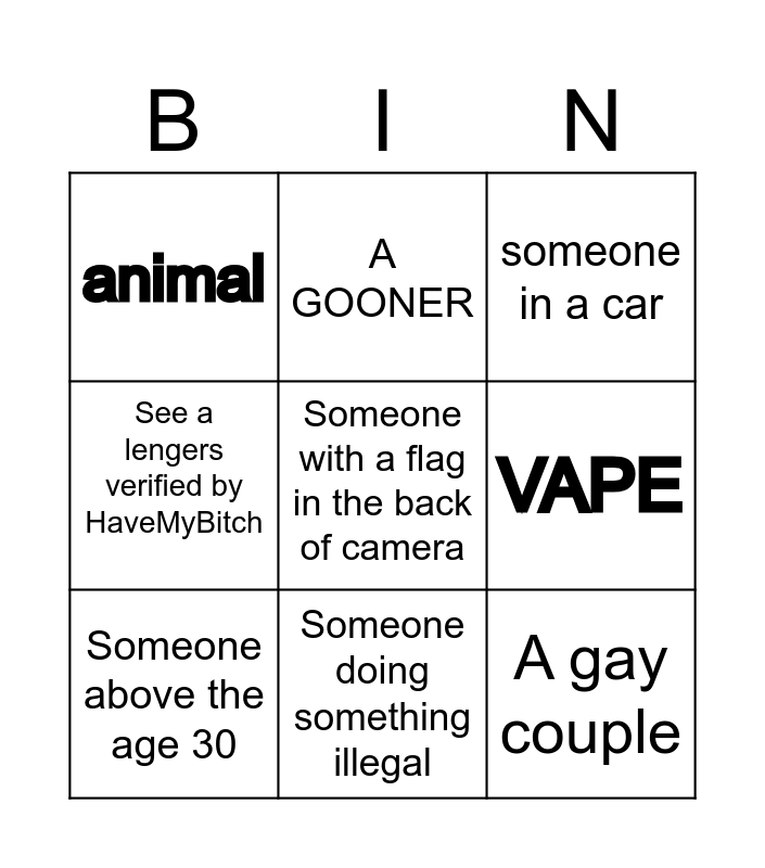 This bingo card has a free space and 8 words: VAPE, someone in a car, A GOONER, Someone above the age 30, animal, A gay couple, See a lengers verified by HaveMyBitch and Someone doing something illegal.
