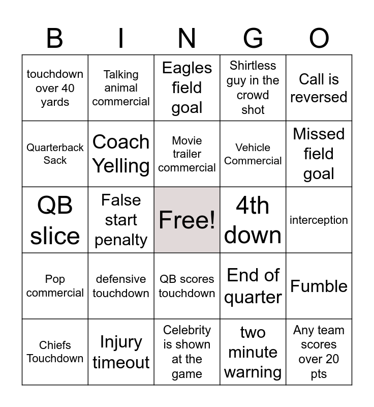 This bingo card has a free space and 31 words: Celebrity is shown at the game, Chiefs field goal, False start penalty, Pototo Chip commercial, touchdown over 40 yards, Eagles field goal, Coach Yelling, End of quarter, 4th down, two minute warning, interception, Any team scores over 20 pts, Tie game at the end of this quarter, End Zone Dance, Missed field goal, Eagles touchdown, Fumble, defensive touchdown, Pop commercial, QB scores touchdown, Call is reversed, Beer Commercial, Chiefs Touchdown, Talking animal commercial, Vehicle Commercial, Quarterback Sack, Shirtless guy in the crowd shot, QB slice, Injury timeout, Movie trailer commercial and The term "3-peat" is said.
