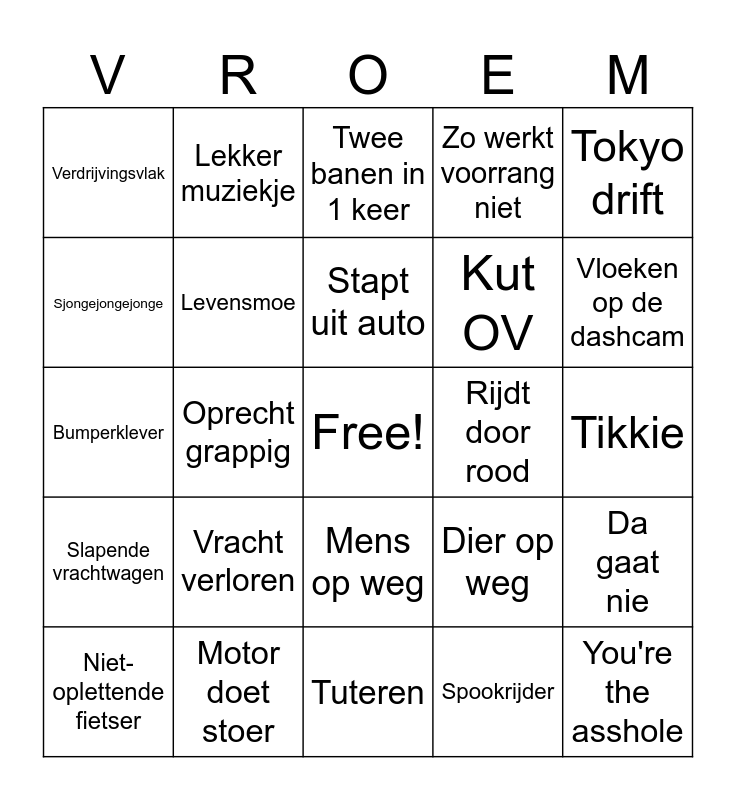 This bingo card has a free space and 34 words: Slalom, Spookrijder, Brake check, Herken de weg, Slapende vrachtwagen, Levensmoe, Tokyo drift, Niet-oplettende fietser, Lekker muziekje, Afslag gemist, Stapt uit auto, Twee banen in 1 keer, Hoe werkt een rotonde, Instant karma, Rijdt door rood, Vloeken op de dashcam, Motor doet stoer, Bumperklever, Vracht verloren, Dier op weg, Mens op weg, Over de stoep, Verdrijvingsvlak, Tikkie, Tuteren, You're the asshole, Zo werkt voorrang niet, Vluchtstrook, Kut OV, Sjongejongejonge, Totaaltje, Oprecht grappig, Da gaat nie and Creatief inhalen.