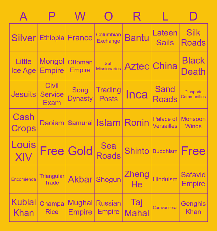 This bingo card has 52 words: Champa Rice, China, India, Daoism, Song Dynasty, Buddhism, Ethiopia, Caravanserai, Lateen Sails, Free, Silk Roads, Sea Roads, Sand Roads, Inca, Zheng He, Gold, Little Ice Age, Black Death, Mughal Empire, Bantu, Aztec, Samurai, Silver, Mongol Empire, Russian Empire, Islam, Monsoon Winds, Taj Mahal, Ottoman Empire, Palace of Versailles, Portugal, Columbian Exchange, Shogun, Hinduism, Louis XIV, France, Cash Crops, Shinto, Encomienda, Triangular Trade, Akbar, Jesuits, Civil Service Exam, Genghis Khan, Trading Posts, Ronin, Free, Sufi Missionaries, Safavid Empire, Kublai Khan, Diasporic Communities and Ibn Battuta.