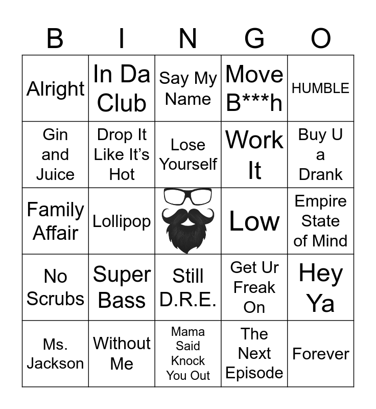 This bingo card has a free space and 26 words: Still D.R.E., The Next Episode, Lose Yourself, Without Me, HUMBLE, Alright, Gin and Juice, In Da Club, Empire State of Mind, Get Ur Freak On, Work It, Family Affair, Hey Ya, Ms. Jackson, Lollipop, Hot in Herre, Move B***h, No Scrubs, Say My Name, Forever, Buy U a Drank, Mama Said Knock You Out, Low, Super Bass, Drop It Like It’s Hot and Yeah!.