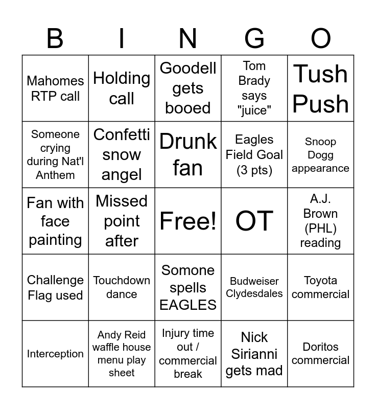 This bingo card has a free space and 39 words: Saquon Barkley TD, Half-time show technical glitch, "bundleruski", Confetti snow angel, Interception, Somone spells EAGLES, Drunk fan, T. Swift sighting, Tush Push, Challenge Flag used, Missed point after, Tom Brady says "juice", Doritos commercial, A.J. Brown (PHL) reading, OT, Touchdown dance, Jalen Hurts QB run, Mahomes RTP call, Chiefs three-peat :(, Budweiser Clydesdales, Someone crying during Nat'l Anthem, Injury time out / commercial break, Eagles Field Goal (3 pts), Snoop Dogg appearance, Chiefs Field Goal (3 pts), Taco Bell commercial, Eagles win!, Politician attends, Tom Brady called the GOAT, Holding call, Lydia eats Jojo's face, A Manning wins Kick of Destiny, Goodell gets booed, Andy Reid waffle house menu play sheet, Nick Sirianni gets mad, Travis Kelce TD, Toyota commercial, Fan with face painting and Jameis Winston appearance.