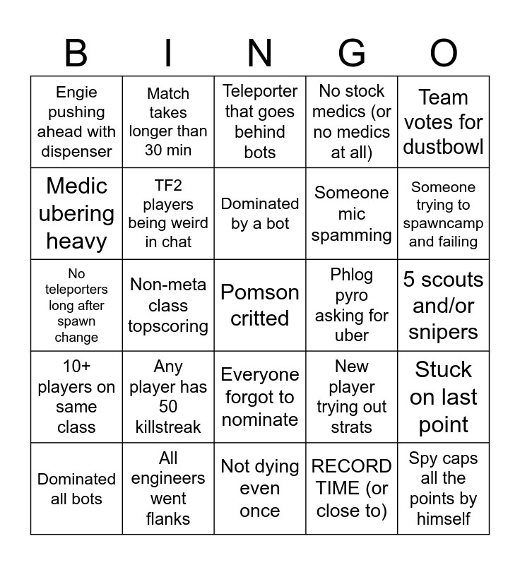 This bingo card has a free space and 24 words: Any player has 50 killstreak, All engineers went flanks, Dominated by a bot, Dominated all bots, Team votes for dustbowl, Engie pushing ahead with dispenser, Medic ubering heavy, Match takes longer than 30 min, Phlog pyro asking for uber, Everyone forgot to nominate, Someone mic spamming, No teleporters long after spawn change, New player trying out strats, Stuck on last point, TF2 players being weird in chat, RECORD TIME (or close to), 5 scouts and/or snipers, Teleporter that goes behind bots, Someone trying to spawncamp and failing, Non-meta class topscoring, Spy caps all the points by himself, 10+ players on same class, No stock medics (or no medics at all) and Not dying even once.