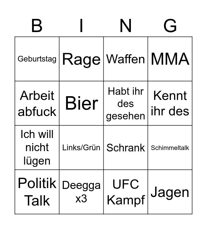 This bingo card has 16 words: Politik Talk, Deegga x3, Waffen, MMA, Arbeit abfuck, Rage, Schrank, Schimmeltalk, Geburtstag, Bier, UFC Kampf, Kennt ihr des, Ich will nicht lügen, Links/Grün, Habt ihr des gesehen and Jagen.