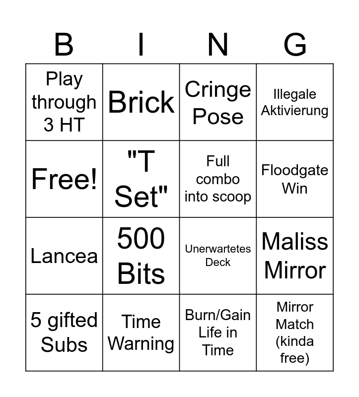 This bingo card has 16 words: Time Warning, Maliss Mirror, Cringe Pose, Play through 3 HT, Lancea, Brick, Unerwartetes Deck, Burn/Gain Life in Time, Free!, "T Set", 5 gifted Subs, Illegale Aktivierung, 500 Bits, Floodgate Win, Full combo into scoop and Mirror Match (kinda free).