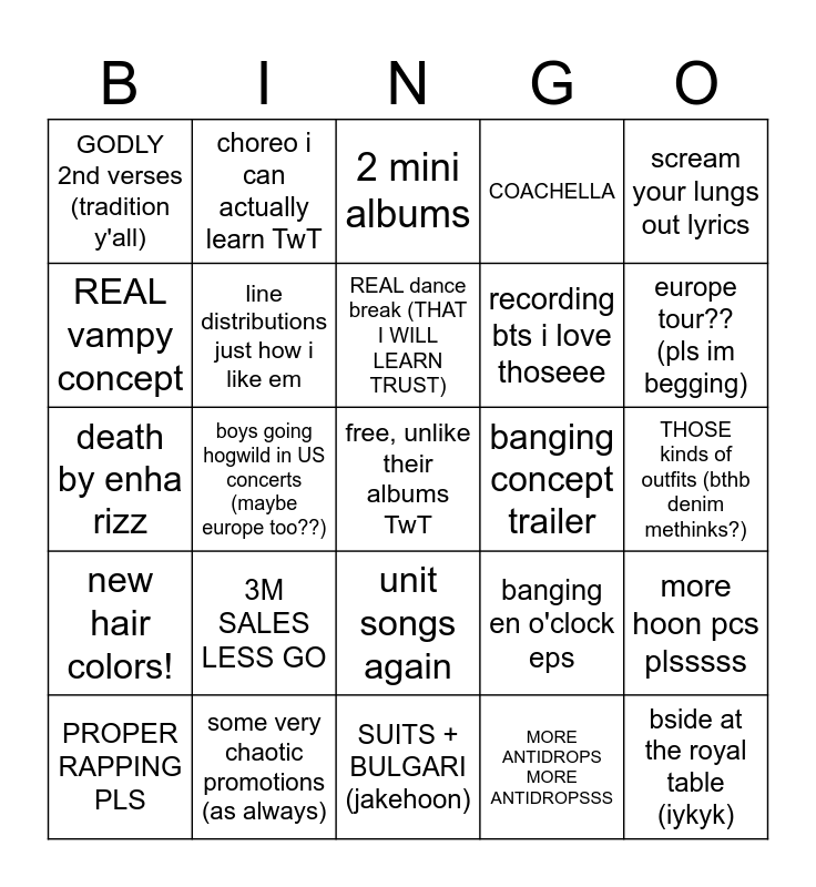 This bingo card has a free space and 24 words: 3M SALES LESS GO, some very chaotic promotions (as always), REAL dance break (THAT I WILL LEARN TRUST), PROPER RAPPING PLS, scream your lungs out lyrics, GODLY 2nd verses (tradition y'all), REAL vampy concept, choreo i can actually learn TwT, banging concept trailer, unit songs again, recording bts i love thoseee, death by enha rizz, banging en o'clock eps, more hoon pcs plsssss, line distributions just how i like em, MORE ANTIDROPS MORE ANTIDROPSSS, THOSE kinds of outfits (bthb denim methinks?), 2 mini albums, europe tour?? (pls im begging), boys going hogwild in US concerts (maybe europe too??), bside at the royal table (iykyk), new hair colors!, COACHELLA and SUITS + BULGARI (jakehoon).