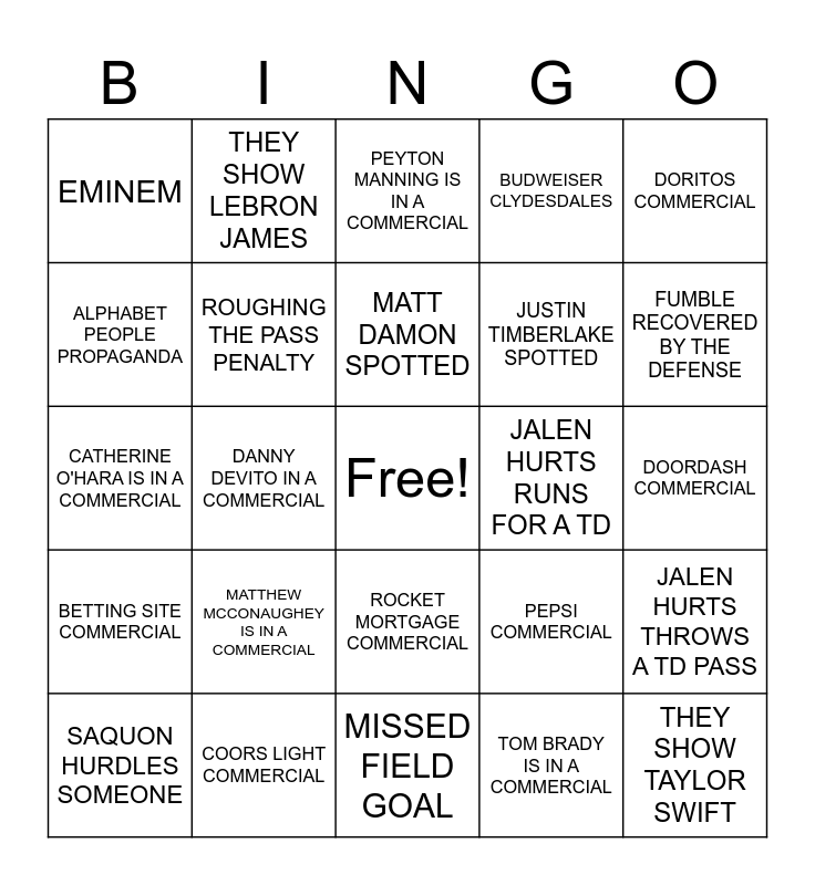 This bingo card has a free space and 44 words: TRAVIS KELCE TD, THEY SHOW TAYLOR SWIFT, THEY SHOW DONALD TRUMP, SAQUON HURDLES SOMEONE, SAQUON TD, TOM BRADY IS IN A COMMERCIAL, PEYTON MANNING IS IN A COMMERCIAL, TURBO TAX COMMERCIAL, DORITOS COMMERCIAL, COORS LIGHT COMMERCIAL, BUDWEISER CLYDESDALES, JALEN HURTS RUNS FOR A TD, ROCKET MORTGAGE COMMERCIAL, MATTHEW MCCONAUGHEY IS IN A COMMERCIAL, THEY SHOW MAMA KELCE IN HER SPLIT EAGLES/CHIEFS SHIRT, MISSED FIELD GOAL, GOODYEAR BLIMP SHOT OF THE STADIUM, CATHERINE O'HARA IS IN A COMMERCIAL, INTERCEPTION, FUMBLE RECOVERED BY THE DEFENSE, THEY SHOW LEBRON JAMES, HE GETS US COMMERCIAL, BEYONCE AND JAY Z, EMINEM, XAVIER WORTHY TD, DOORDASH COMMERCIAL, T-MOBILE COMMERCIAL, COCA-COLA COMMERCIAL, PEPSI COMMERCIAL, BETTING SITE COMMERCIAL, PATRICK MAHOMES THROWS A TD PASS, JALEN HURTS THROWS A TD PASS, TACO BELL COMMERCIAL, CHRIS PRATT, DANNY DEVITO IN A COMMERCIAL, CHEEZ-ITS COMMERCIAL, TONY ROMO IN A COMMERCIAL, BRADLEY COOPER SPOTTED, MATT DAMON SPOTTED, ALPHABET PEOPLE PROPAGANDA, JUSTIN TIMBERLAKE SPOTTED, SNOOP DOGG SPOTTED, ROUGHING THE PASS PENALTY and THEY SHOW JASON KELCE.