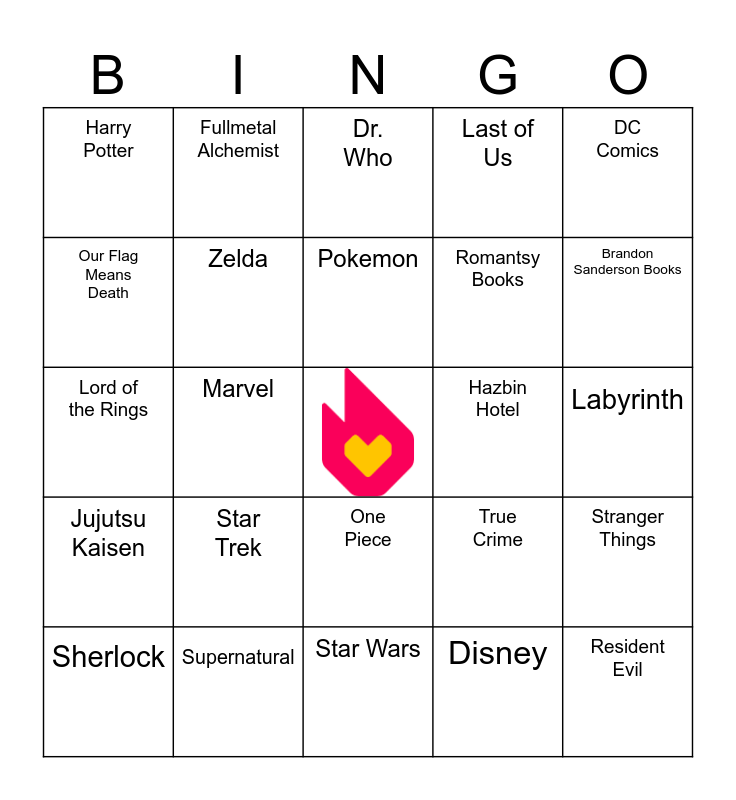 This bingo card has a free space and 24 words: Star Trek, Supernatural, Pokemon, Sherlock, DC Comics, Harry Potter, Our Flag Means Death, Fullmetal Alchemist, Hazbin Hotel, One Piece, Romantsy Books, Lord of the Rings, True Crime, Stranger Things, Zelda, Disney, Labyrinth, Dr. Who, Brandon Sanderson Books, Marvel, Resident Evil, Jujutsu Kaisen, Last of Us and Star Wars.