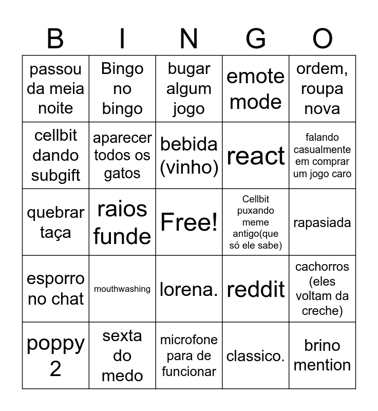 This bingo card has a free space and 24 words: mouthwashing, sexta do medo, bebida (vinho), poppy 2, ordem, roupa nova, passou da meia noite, cellbit dando subgift, Bingo no bingo, Cellbit puxando meme antigo(que só ele sabe), lorena., react, quebrar taça, reddit, cachorros (eles voltam da creche), aparecer todos os gatos, classico., rapasiada, bugar algum jogo, falando casualmente em comprar um jogo caro, raios funde, brino mention, esporro no chat, emote mode and microfone para de funcionar.
