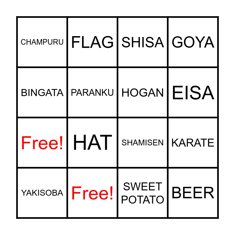 This bingo card has 20 words: KARATE, TAIKO, SHISA, ANDAGI, YAKISOBA, BINGATA, Free!, CHAMPURU, Free!, FLAG, HAT, SHAMISEN, PARANKU, BEER, HOGAN, GEORGE, EISA, GOYA, SWEET POTATO and SHWIKASA.