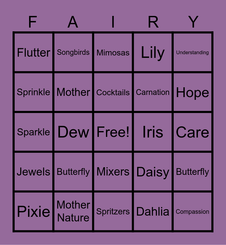 This bingo card has a free space and 28 words: Wings, Butterfly, Mimosas, Rose, Understanding, Flutter, Mother, Cocktails, Daisy, Butterfly, Sparkle, Dew, Tulip, Compassion, Sprinkle, Mother Nature, Spritzers, Carnation, Hope, Pixie, Songbirds, Mixers, Iris, Care, Jewels, Dahlia, Lily and Orchid.