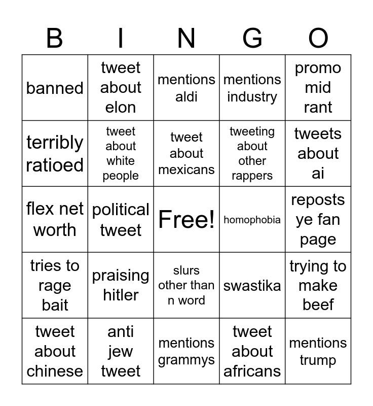 This bingo card has a free space and 24 words: praising hitler, anti jew tweet, tweet about mexicans, tweet about chinese, promo mid rant, banned, terribly ratioed, tweet about elon, homophobia, slurs other than n word, tweeting about other rappers, flex net worth, swastika, trying to make beef, tweet about white people, tweet about africans, reposts ye fan page, mentions aldi, tweets about ai, political tweet, mentions trump, tries to rage bait, mentions industry and mentions grammys.