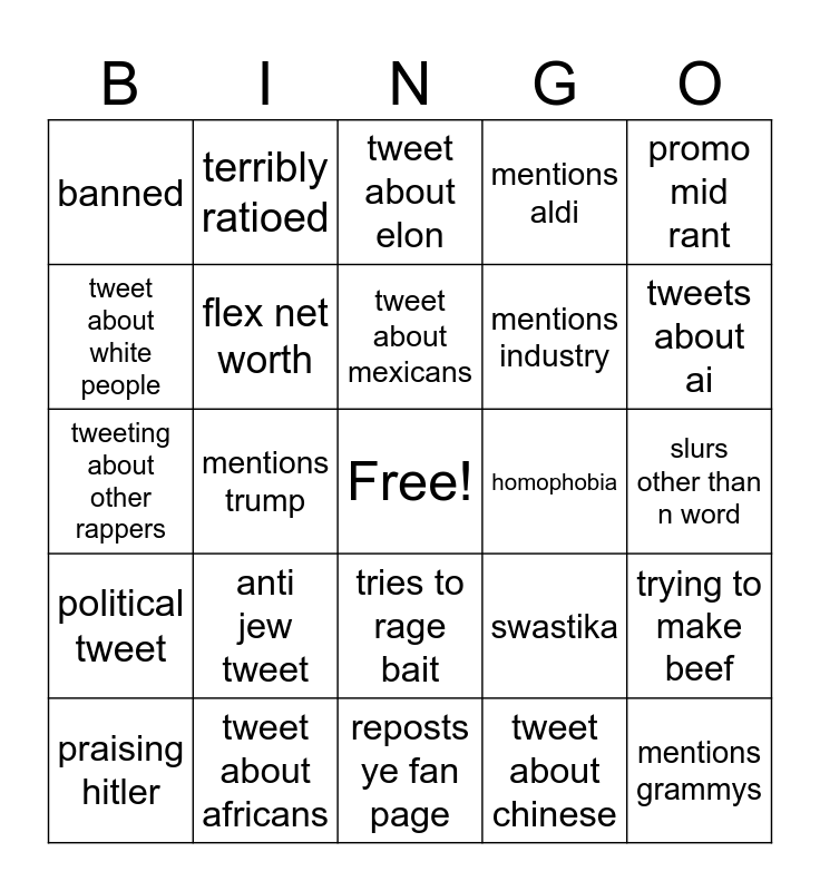 This bingo card has a free space and 24 words: praising hitler, anti jew tweet, tweet about mexicans, tweet about chinese, promo mid rant, banned, terribly ratioed, tweet about elon, homophobia, slurs other than n word, tweeting about other rappers, flex net worth, swastika, trying to make beef, tweet about white people, tweet about africans, reposts ye fan page, mentions aldi, tweets about ai, political tweet, mentions trump, tries to rage bait, mentions industry and mentions grammys.
