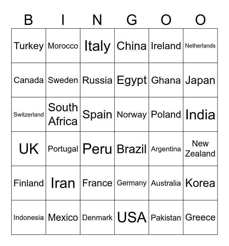 This bingo card has 36 words: Germany, France, USA, Canada, UK, Norway, Sweden, Denmark, Ireland, Australia, Japan, China, Korea, South Africa, Egypt, Turkey, Finland, Poland, Switzerland, Italy, Spain, Portugal, Brazil, Peru, Argentina, Morocco, Ghana, Mexico, Russia, Netherlands, Greece, Indonesia, New Zealand, India, Iran and Pakistan.