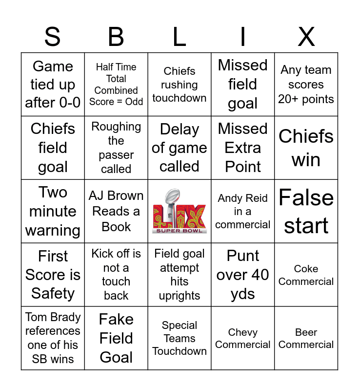 This bingo card has a free space and 80 words: Chiefs passing touchdown, Eagles passing touchdown, Chiefs rushing touchdown, Eagles rushing touchdown, Defensive stop on 4th down, Taylor Swift shown, Offensive fumble & defensive recovery, 2 point conversion, Touchdown over 40 yards, Tush push, Chiefs throw interception, Eagles throw interception, Missed field goal, Game tied up after 0-0, Eagles field goal, Chiefs field goal, End zone dance, Kick off is not a touch back, Challenge flag thrown, False start, End of quarter, Any team scores 20+ points, Two minute warning, Delay of game called, Roughing the passer called, Travis Kelce reception over 15 yards, Saquon Barkley rush over 15 yards, Eagles timeout, Chiefs timeout, Kendrick Lamar halftime show, Chiefs win, Eagles win, Special Teams Touchdown, Defensive Touchdown (pick 6 or scoop and score), Tom Brady references one of his SB wins, Andy Reid in a commercial, Mahomes appears in a commercial, Kelce Appears in a commercial, Pass interference is called, Beer Commercial, Pizza Commercial, State Farm Commercial, "Three Peat", Chiefs lead at halftime, Half Time Total Combined Score = Even, Half Time Total Combined Score = Odd, Eagles Get a Sack, Chiefs Get a Sack, Eagles Lead at Halftime, Pepsi Commercial, Coke Commercial, AJ Brown Reads a Book, Punt over 40 yds, Punt inside the 10 yd line, Fake Punt, Onside Kick, End Around, Saquan hurdles defender, "GOAT" mentioned, Field goal attempt hits uprights, Missed Extra Point, Chiefs receive opening kick off, Eagles receive opening kick off, Coin toss is Heads, Coin toss is tails, Game Tied at half time, Chiefs get first score of the game, Eagles get first score of the game, First Score is Field Goal, First Score is Touchdown, First Score is Safety, Fake Field Goal, Dunkin Commercial, Chip Commercial, Failed 4th down conversion, Ford Commercial, Chevy Commercial, Fox Tv Show Commercial, Hulu Commercial and New Movie Commercial.