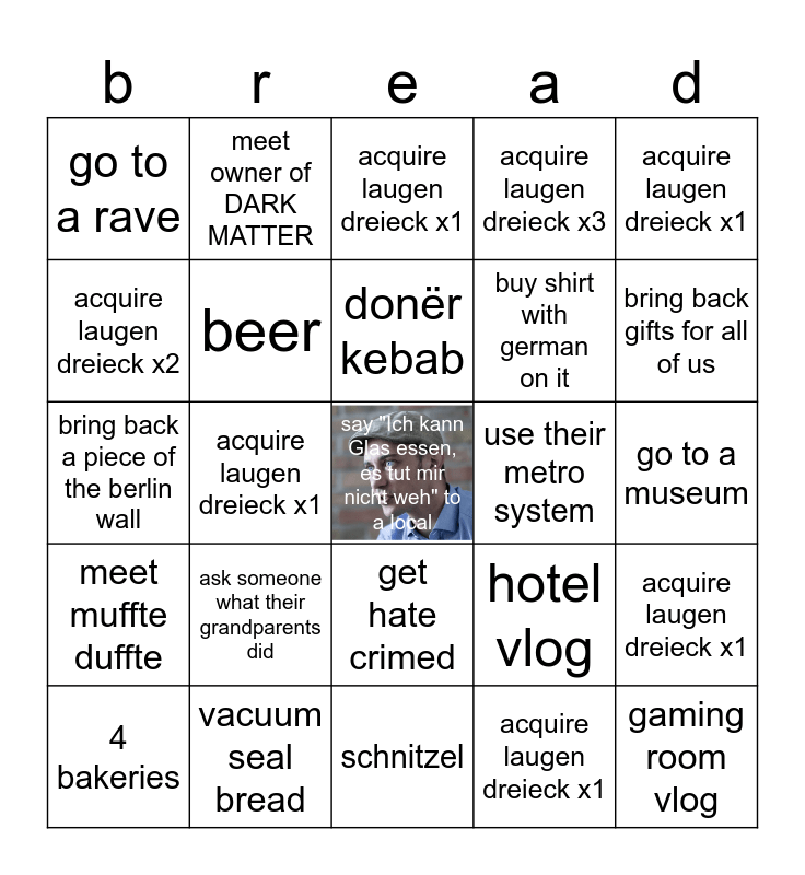 This bingo card has a free space and 24 words: ask someone what their grandparents did, vacuum seal bread, donër kebab, 4 bakeries, acquire laugen dreieck x1, go to a rave, acquire laugen dreieck x2, meet owner of DARK MATTER, use their metro system, get hate crimed, buy shirt with german on it, bring back a piece of the berlin wall, hotel vlog, acquire laugen dreieck x1, beer, acquire laugen dreieck x1, go to a museum, acquire laugen dreieck x1, bring back gifts for all of us, acquire laugen dreieck x1, gaming room vlog, meet muffte duffte, acquire laugen dreieck x3 and schnitzel.