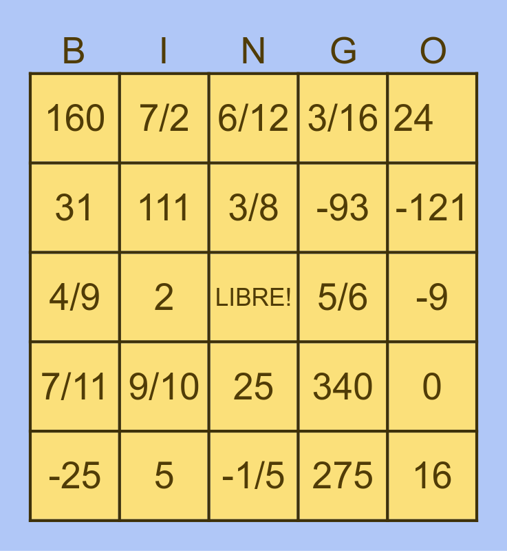 This bingo card has a free space and 24 words: -25, 9/10, 3/8, 275, 24, 160, 7/2, 6/12, 5/6, -9, 4/9, 111, 340, 0, 31, 5, -1/5, 3/16, -121, 7/11, 2, 25, -93 and 16.