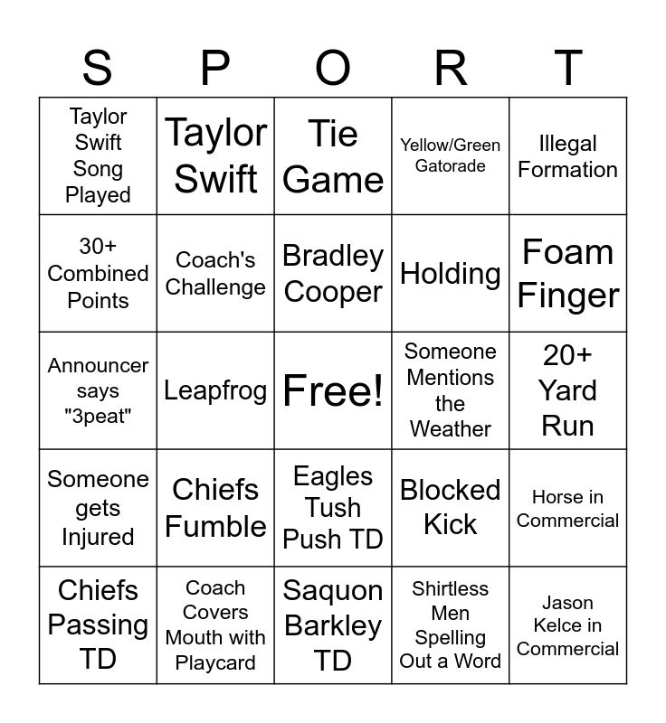 This bingo card has a free space and 92 words: Patrick Mahomes TD, Jalen Hurts TD, Saquon Barkley TD, Travis Kelce TD, Xavier Worthy TD, Eagles Passing TD, Eagles Rushing TD, Chiefs Passing TD, Chiefs Rushing TD, Chiefs Intercept the Ball, Eagles Intercept the Ball, Missed Field Goal, False Start, Holding, Pass Interference, Illegal Formation, Tie Game, Face Mask, Chiefs Down at End of Qtr, 2-Point Attempt, Unnecessary Roughness, Eagles Timeout, Chiefs Timeout, Eagles Fumble, Chiefs Fumble, Coach's Challenge, Mahomes Books it for 1st Down, Camera Shot of Stadium, Camera Shot of Bourbon Street, Cheerleaders, Coach Covers Mouth with Playcard, Eagles Tush Push TD, Taylor Swift High Five, Taylor Swift Mentioned by Announcers, Taylor Swift, Jason Kelce, Mama Kelce, Paul Rudd, Bradley Cooper, Blocked Kick, Announcer says "3peat", Someone gets Injured, 20+ Yard Run, Mahomes in Commercial, Jason Kelce in Commercial, Andy Reid in Commercial, Travis Kelce in Commercial, Mama Kelce & Mama Swift Hugging, Celebration Dougie, Celebration Griddy, Celebration Shimmy Shake, Referee Huddle, Diving Catch, QB Sack, 35+ Yard Pass, 10+ Score Difference, 25+ Points Scored, 30+ Combined Points, One-Hand Catch, Leapfrog, Kermit the Frog, Fancy Fingers, Beer Chug, Shirtless Dude, Full-Face Paint, Shirtless Men Spelling Out a Word, Sad Fan in Ridiculous Outfit, Mascot, Someone Cries, Blue Gatorade, Purple Gatorade, Orange Gatorade, Yellow/Green Gatorade, Commercial that Makes Zero Sense, Commercial that Makes Everyone Cry, Commercial Featuring 5+ Celebrities, Horse in Commercial, Blimp, Fireworks, Angry Coach, Someone Throws Their Helmet, Someone Mentions the Weather, Taylor Swift Song Played, Kendrick Lamar Performs “Bad Blood”, Taylor Swift & Brittany Mahomes Hugging, Jason Kelce Does Something Ridiculous, Kelce Archer Pose, Someone Yells at the Ref, New Orleans Skyline, Someone Mentions Jason Kelce’s Retirement, Foam Finger and Crazy Wig.
