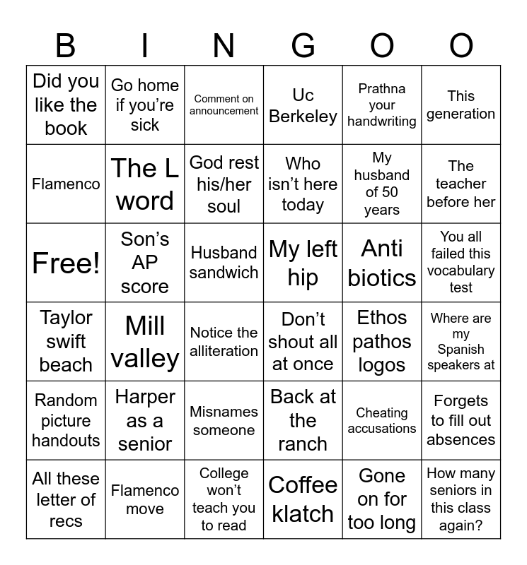 This bingo card has 36 words: Back at the ranch, Misnames someone, Coffee klatch, Flamenco, Taylor swift beach, My left hip, The L word, College won’t teach you to read, Prathna your handwriting, Cheating accusations, The teacher before her, Uc Berkeley, Forgets to fill out absences, Son’s AP score, Who isn’t here today, Did you like the book, Random picture handouts, Anti biotics, Free!, Comment on announcement, Husband sandwich, Mill valley, Don’t shout all at once, Notice the alliteration, Ethos pathos logos, Go home if you’re sick, My husband of 50 years, Flamenco move, God rest his/her soul, This generation, How many seniors in this class again?, All these letter of recs, Where are my Spanish speakers at, You all failed this vocabulary test, Harper as a senior and Gone on for too long.